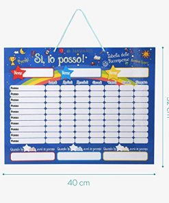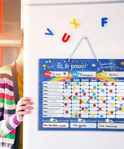 DETTAGLI: 1x cartellone magnetico 40x32cm in carta / 3x 80 calamite a forma di stella (rosso, blu, giallo), 10x magneti per i compiti, 1x pennarello magnetico, 1x custodia in PVC / lingua: italiano. Non adatto ai bimbi sotto i 3 anni.