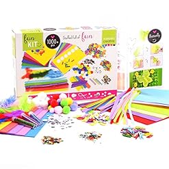 UN AMPIO KIT ARTISTICO – 1000 oggetti creativi! Ogni kit contiene 15 piume, 6 fogli di feltro (A5), 6 fogli di gommapiuma (A5), 180 lettere dell’alfabeto adesive in gommapiuma, 25 bastoncini per lecca-lecca in gommapiuma, 30 mollette da bucato, 3 tubetti di glitter, 30 pompon, 12 scovolini, 100 strass, 100 occhi adesivi, 500 paillettes e 6 sfere di polistirolo