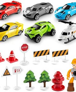 Set di auto per aerei abbondanti: include 1 aereo cargo, 5 auto, 1 elicottero, 1 operaio edile e 11 accessori.